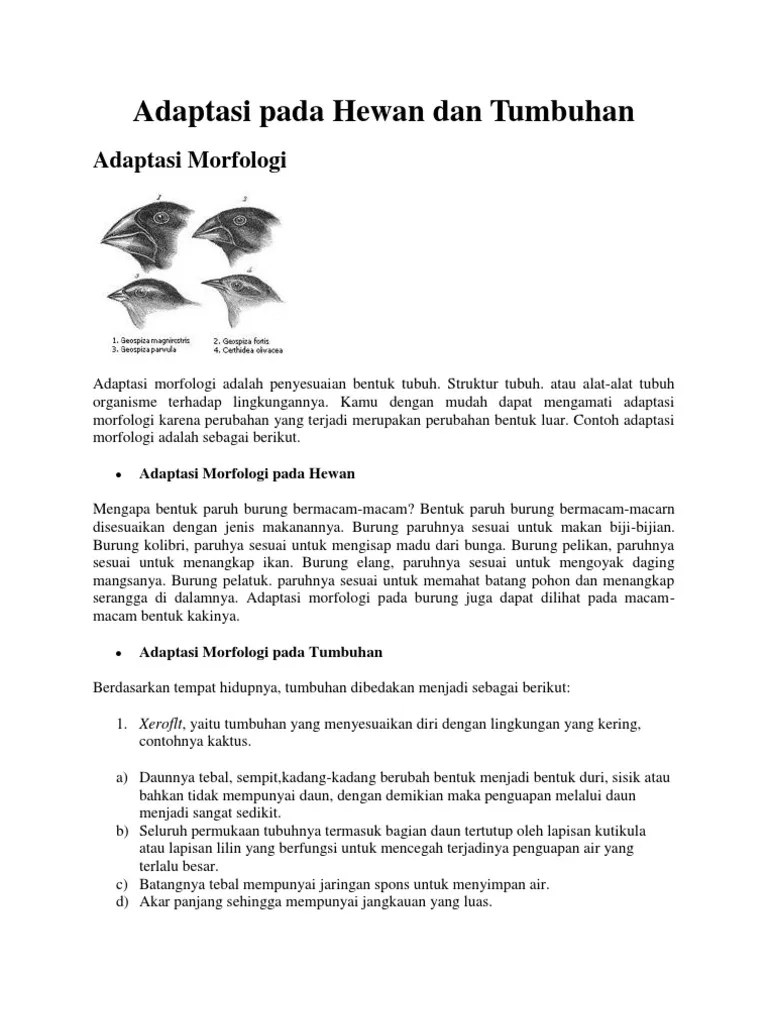 Artikel yang mungkin berhubungan : Berbagai satwa melakukan adaptasi atau penyesuaian diri meliputi morfologi, fisiologi dan tingkah laku. Hal ini adalah contoh dari adaptasi. Contoh adaptasi morfologi pada hewan adalah ragam jenis paruh dan kaki burung dan tipe mulut serangga. Adaptasi ini bisa berupa enzim yang dihasilkan suatu organisme. Pengertian seleksi alam dan contoh. Yang meliputi pengertian adaptasi morfologi, contoh adaptasi morfologi yang terjadi pada manusia, hewan dan tumbuhan . 7) hewan pemakan tumbuhan (herbivora) memiliki usus yang lebih panjang dari pada karnivora.